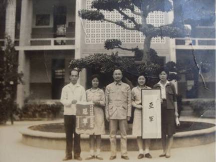 每次演講比賽獲得優勝是先父最樂之事,他總是眉開眼笑許久 左二為高中時代的我參加校外比賽得到冠軍與左三校長右一導師合影