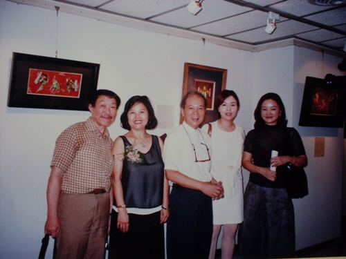 自左 詩人商禽、作者、詩人楚戈及三立電視台主播、作家 於1999年8月「衣錦繡」作品展酒會上