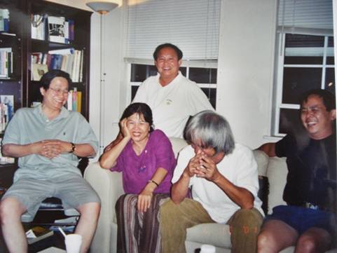右起方圓、銀髮、王育梅、秋原與後站立者方圓哥哥陳建華 大家談起詩人本銘生前糗事,不禁都笑出眼淚久未能止。