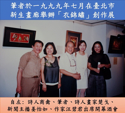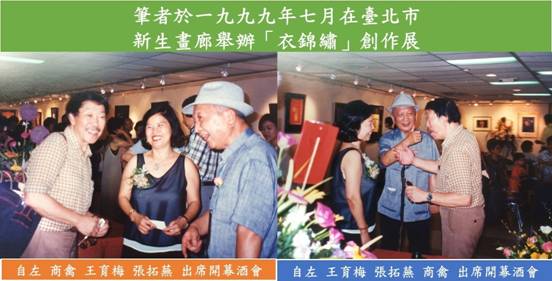 1999年七月卅一日,已故作家張拓蕪與已故詩人畫家楚戈和商禽,聯袂出席我在臺北市新生畫廊舉辦「衣錦繡」創作展的開幕酒會。