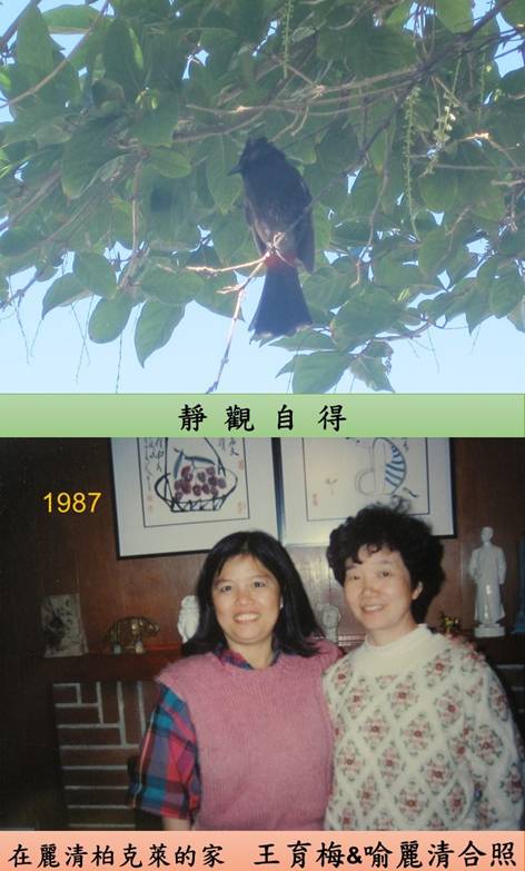 圖a拼貼創作《訪客》 b麗清化身的蝴蝶幻影 2017.8.4 Honolulu, HI 圖c鳥 蝴蝶 樹葉 d草地上的蝴蝶&花2017.8.5 Honolulu HI 圖e 靜觀自得f 1987與麗清初識在麗清柏克萊的家王育梅與喻麗清合照 圖g喻麗清在詩會上(圖取自北美華文作家協會網站)