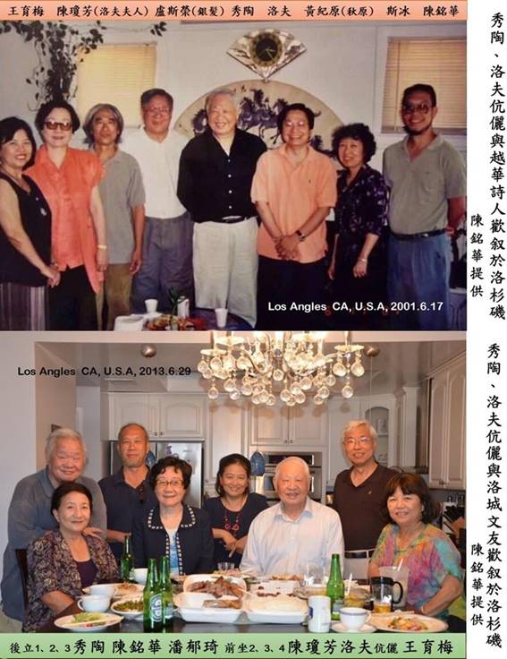 元子坊(阮智芳)是銘華舊居所在處,他家住街頭,陳國篡街交街處像是在街尾。銘華和我分享這首洛夫的詩說,「這首詩的發表,我才十二歲剛讀完小學。」 銘華第一次見到洛夫,大概是1991或92年,台灣現代詩人到美國作巡迴朗誦。他下班後,開車和新大陸詩刊藥河等一班朋友,開了兩個小時車程到聖地牙哥加大校園聽朗誦。之後,到葉家和洛夫聚到深宵,才回洛杉磯。 1996年銘華和秀陶去溫哥華探望剛移民加國的洛夫和瓊芳。那時洛夫沒有車子,但卻特別租了一部車到機場接他們,接待他們住在洛夫的家。那幾天,銘華負責開車,大家到處遊玩、談天說地到深夜。他也寫了一篇訪問記,與洛夫到加拿大後刊載在新大陸詩刊的新作,出了一個特輯。 2001年台灣詩人簡政珍到洛城探親,洛夫也趁此到洛杉磯探望老友,銘華在洛杉磯長青書局舉辦一個小規模的「現代詩座談會」,會後,大家到銘華家烤肉。 接下來的幾天,陳銘華開車載他們到聖地牙哥找葉維廉,去洛城的兩個博物館,那次洛夫玩得很開心。 陳銘華說:「我們為洛夫所辦的詩會,不是活動,是相敘。不管是我們去參加他們的詩會或是他到洛杉磯,洛夫對我們就像對老朋友一樣。」 在洛杉磯的越華詩人較少參加當地社團的活動,但是洛夫對他們並不陌生。有越南情結的洛夫,2009年曾回到闊別42年的西貢。 陳銘華說:「由於存在主義思潮和臺灣現代詩在六0、七0年代席捲越華文壇,洛夫又到過越南,對當時的越華詩人影響很大。當時在越南的銀髮、秋原和藥河等都和洛夫有交流。」 從幾位越華詩人所取的筆名;雪夫、亞夫、村夫、季夫(荷野補充)等等,可見洛夫對越華詩壇的影響。 2016年12月銘華又去臺灣,並拜訪洛夫,他送銘華一本再版的《石室的死亡》,上面寫著:給老友銘華。銘華說:「何其幸哉,洛夫視我這個晚輩為老友。」 當時他們一起上洛夫臺北家的樓梯時,銘華要扶他,但是洛夫拒絕,他要自己走上去;沒想到那次一別就是永別了。