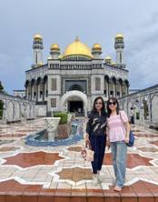 二十日 我們來到久聞盛名的傑米清真寺,這是第廿九任蘇丹在一九九○年代主持修建,也是全汶萊最大的清真寺。屋頂共有廿九個圓拱頂,都鍍上了24K黃金,金的厚度達二公分,是全球造價最高的清真寺,也成為該國富庶安寧的象徵。