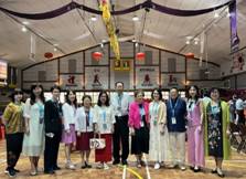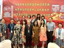廿一日晚宴,來自不同地域的文友多已蒞臨,喜見睽違多年的小華、瑞琳、華純、立秋等。洛杉磯好友宇桐也及時由香港抵達。晚宴中北美代表團臨時決定提供一個餘興節目,選擇了林德憲顧問的「滄桑中的暗香」詩章,由秀臻、筱意、婉青和我分段朗誦,北美作協前會長趙俊邁夫人雯琳伴舞,獲得熱烈掌聲。