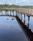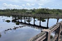 ,這是個十分值得一遊的公園景區,坐落在一片淡水沼澤森林中。明淨透亮、光可鑑人的水面,清晰映現彎曲綿延的棧橋倒影,叢叢水草,田田蓮葉散佈其間,憑添詩意幾許!林蔭深處見到一棟歷史悠久的木屋,是前巫金領袖