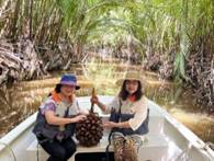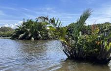 ,可口且提神。其後去到都東河碼頭,穿上救生衣,乘船遊河,尋找油棕果。都東河沿岸旺長著油棕樹,其果實主要用於生產棕櫚油。河岸穿行,偶見捕大頭蝦的小船棲於油棕樹下,也看到河岸上的成群水牛,悠然覓食,一派清幽的鄉村野趣。