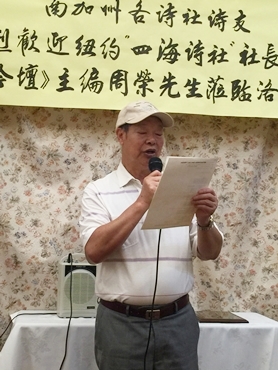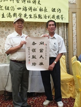 歡聚重樓晤俊賢 吟翁才德逸香妍 飄零書劍求真理 唱詠湖山樂自然 對菊每開陶令酒 濡毫屢展薛濤箋 辛勤墾拓名山業 騷苑頻贏錦繡篇 蘭芳槐秀碧平夷 今喜才賢畢至時 修竹茂林催俊雅 流觴曲水憶融怡 精深倍覺知音貴 恆久神交掃徑遲 祈願騷壇多彥秀 詩縈正氣漫雲湄