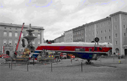 附註● 這個名叫"A Helicopter Upside Down in a Public Place" 的裝置藝術是布拉格慶祝莫扎特250 歲生日的活動之一,作者Paola Pivi 為意大利當代藝術家,1971年生於米蘭,她的作品大多如謎語般,荒謬而幽默。她喜歡用演出的方式安排攝影作品,把動物運到遙遠的地方——斑馬在雪山傍,鴕鳥在海面上——造成一種突兀的感覺,讓觀眾從日常百無聊賴的生活中得到片刻的解脫。她的一幅33X44 英尺的得獎攝影作品(一頭驢子顫巍巍站在一只小船上)最近被美國的布朗大學買去掛在該校科學圖書館的牆頭上。當然,不是每個人都欣賞這類作品。我在網絡的一個部落格上便讀到一位比我們晚兩三天到此一遊的美國教授,用略帶調侃的口吻,談到這個倒置直升機的裝置藝術:「我喜歡這架直升機,但如果它是正立的,我也會喜歡,所以我不太能確定它的吸引力究竟是什麼。… 如果它是一架軍用直升機或許我會更有興趣。…」 第二天我們再回到這廣場,看到一群警察正用一架吊車把一部汽車高高吊起。大概是在架設另一個令人驚異的當代裝置藝術吧?背景的噴水池是電影《音樂之聲》女星 Julie Andrews 同小孩們在池邊大唱 Do-Re-Mi 的地方。 (2006年5月27日)