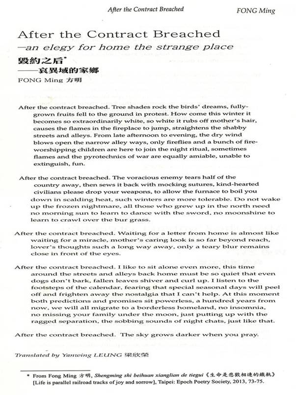 毀約之后。頑敵撕著半截江山,然後用嘲 笑來縫紉它的完整,善良的百 姓們且放下你的武器,讓熔爐 煮得你們水深火熱,這樣冬季 比較好過。勿搖醒凍僵的夢魘, 凡北方長大的,都無需朝陽 便懂舞劍,無須月色便懂攀越 蒺藜。