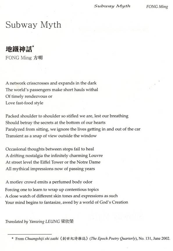 彼此擦肩卻窒息得深怕呼吸 會洩露心底之秘密 坐姿麻痺無視上落車廂的生命 匆促如窗外一瞬翦景