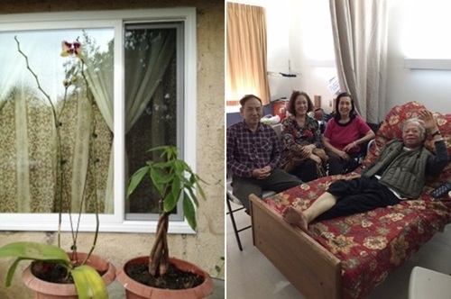 ●照片說明: 左:此屬1月5日2017年。黃己立笛兄到U.C.I 醫院Emergency 深切治療室,探候江志遠攜同的禮物。當家居擺設在門外窗前盆栽內,雖幾經風雨摧殘,嚴寒侵襲,移植後蝴蝶蘭,竟花蕾含苞待放。《富貴樹》亦稱《發財樹》欣欣向榮,充滿了活力生機,呈現着喜悅訊息。但願一切預兆平安,衆人「吉祥如意」。 右:中國東莞鄕親 (左)萬卓均,劉葵芳夫婦到來美國。在Pacific Haven 療養院,探望江志遠閒話家常時,合攝于2月12日2017年。