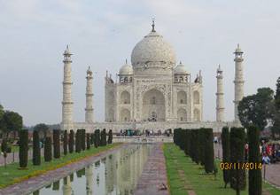 沙賈汗(Shahjahan)國王懷念她死去的皇后泰姬,經過10年的建造於1643年完成的陵墓。泰姬陵的建築用料、構圖和花園設計的靈感來自胡馬雲陵墓和伊特瑪陵墓的啟發,其表現出來的藝術美感、壯觀又兼具優雅的恢弘氣勢卻是無可匹敵的。精美的彩色硬質寶石馬賽克鑲嵌成的白色大理石陵墓,配上花卉的圖案,安置在廣闊花園的末端,有別於其他的陵墓放在正中央,波斯風格花園內的運河和噴泉,添加了恍如置身天堂的魅力。