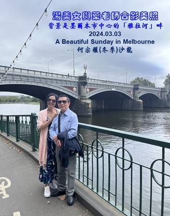 謹附拙詩文「另一種亮麗」敬請榮總斧削指正。並附上湯美女與葉老師合影美照一幀,背景是墨爾本市中心的「雅拉河」畔。