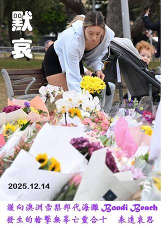 beach)發生的槍擊案件。據稱是一對「父子兵」上陣濫殺無辜,針對當地猶太教會在海灘公園主辦光明節的年度慶祝活動。拙詩謹向無辜亡靈合十表達哀思
