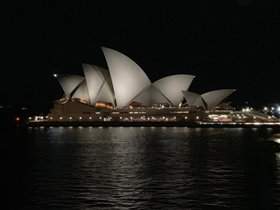 悉尼夜幕冬裝。黑蒼茫。白貝殼歌劇院,水中央。