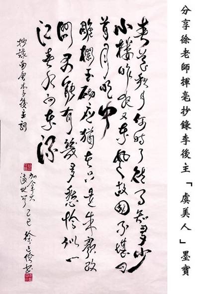 日前徐老師揮毫抄錄李後主「虞美人」分享墨寶。一時靈感湧現,不禁信筆塗鴉遂成拙文「只是朱顏改」如下,敬請先生費神斧正。感恩再感恩!