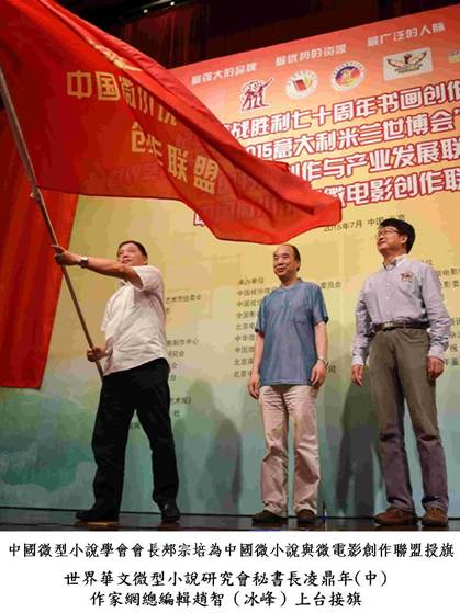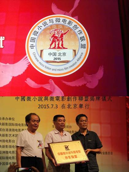 2015年7月3日上午,中國微小說與微電影創作聯盟揭牌儀式、全國書畫創作與產業發展聯盟成立儀式、紀念抗戰勝利七十週年書畫創作研討會暨世界藝術之旅——2015米蘭世博會書畫藝術作品展啟動儀式,同時在中央新影集團主樓禮堂舉行。 海軍航空兵原副政委、中國八一將星書畫院院長李春明將軍,總政保衛部原部長、海軍政治部副主任張雙虎將軍,中央電視台副台長、中央新影集團董事長兼總裁高峰,國務院新聞辦原秘書長馮希望,全國政協委員、中國書法家協會副主席趙長青,亞洲微電影藝術節組委會副主席董萬章,中國發展戰略學研究會現代服務業戰略專業委員會主任張克揚,中央新影書畫院副院長、中國微電影產業聯盟副主席李道瑩,2015米蘭世博會KIP國際館組委會主席熊原女士,2015米蘭世博會KIP國際館組委會首席運營官、亞非拉國際合作交流協會秘書長尹建權,意大利駐華使館參贊菲德洛克,中國台港電影研究會會長、中國電影家協會電影文學創作委員會主任張思濤,中國電影評論學會會長章柏青,中國電影集團精神文明辦公室副主任王迎慶,新華社手機電視台台長李勤,北京南宮世界藝術城有限公司總裁莊雪昌,中國微型小說學會會長郟宗培,世界華文微型小說研究會秘書長凌鼎年,作家網總編輯趙智(冰峰),《中國當代書畫藝術報》柳蔭,《當代中國畫報》社總編輯武桐雨等,有關部門的領導有:外交部政策研究司原副司長、中國前駐斯里蘭卡、馬爾代夫大使江勤政,國家旅遊局原巡視員邵春,全國道德文化公益聯盟秘書長關樂原,和有關方面專家學者——曾在影視劇《青春之歌》《早春二月》《小二黑結婚 》中飾演主要角色的著名表演藝術家謝芳、張目,曾在影視劇《喜盈門》《咱們的退伍兵》中飾演主要角色的著名演員溫玉娟,曾在影視劇《水滸傳》《三國演義》《西游記》中飾演主角的著名演員臧金生等藝術家,出席活動的學者有高健、劉國喜、馬晶、劉茹,來自美國紐約的主持人石依依;全國文藝界和微電影界專家學者魏光朗、海劍、許獻超、白若薇、韓旭東、鄭鵬飛等專家以及新華社、《人民日報 》、中央人民廣播電台、中國國際廣播電台、中央電視台等二百多位來自全國各地的企業家、藝術家、新聞記者出席了活動,著名主持人王玲玲主持了系列活動。 中央電視台副台長、中央新影集團董事長兼總裁高峰致辭,他說:在中央新影 ,我們已經舉行了多種形式的微電影合作,這次的活動更有意義。因為現在無論是微電影還是電影,我覺得,我們國家還有一個需要改進文學缺位的問題。如果能夠把文學缺位的問題解決好,那麼我們的電影事業、電視劇事業都能夠達到一個新的高度和水平。我們的微小說和微電影才能夠真正的建立起聯盟,微電影的事業才會發展的更為良性,更有水準,才能產生更有品質的微電影作品。 中國作家協會黨組成員、副主席、書記處書記李敬澤在賀信中指出:微電影、微小說是時代的產物,中國微小說與微電影創作聯盟的成立,讓文學與影視又找到了一個新的跨界整合的方式,我相信,這一舉措,一定會為推動文學與影視事業的發展與繁榮做出貢獻。 中央新影集團微電影發展中心主任鄭子、副主任宋志芬分別宣讀了《關於中央新影集團同意成立全國書畫創作與產業發展聯盟的通知》和《關於中央新影集團同意成立中國微小說與微電影創作聯盟的通知》的文件。作家網總編輯趙智(冰峰) 、美國全美作家聯誼會會長冰凌分別宣讀中國作家協會黨組成員、副主席、書記處書記李敬澤和中國作家協會副主席、中國微小說與微電影創作聯盟名譽主席蔣子龍的賀信。 中央電視台副台長、中央新影集團董事長兼總裁高峰為全國書畫創作與產業發展聯盟授旗,中央新影集團微電影發展中心主任鄭子和中央新影書畫院副院長李道瑩接旗;亞洲微電影藝術節組委會副主席董萬章為世界藝術之旅――2015米蘭世博會書畫藝術作品展組委會授旗,北京南宮世界藝術城總裁莊雪昌、《亞洲微電影 》雜誌副主編劉玉龍接旗;中國微型小說學會會長郟宗培為中國微小說與微電影創作聯盟授旗,世界華文微型小說研究會秘書長凌鼎年、作家網總編輯趙智(冰峰)上台接旗。 著名表演藝術家謝芳、張目上台演唱《遊擊隊之歌》,為現場的觀眾帶來的精彩節目,引起一陣轟動。詩朗誦《不屈的精神》由著名演員溫玉娟、臧金生上台朗誦,這首詩是一位旅居美國文化學者魏幗的推薦,由北京詩人藍姍創作的,激情洋溢的詩句,聲情並茂的情緒,愛國主義的情懷,給廣大觀眾帶來震憾和啟迪。 著名表演藝術家謝芳、張目,國務院新聞辦原秘書長馮希望,亞洲微電影藝術節組委會副主席董萬章,中國前駐斯里蘭卡、馬爾代夫大使江勤政,中國台港電影研究會會長張思濤,中國電影評論學會會長章柏青,中國發展戰略學研究會現代服務業戰略專業委員會主任張克揚,中央新影書畫院副院長李道瑩,北京南宮世界藝術城有限公司總裁莊雪昌共同為世界藝術之旅――2015米蘭世博會書畫藝術展活動、全國書畫創作與產業發展聯盟揭牌、中國微小說與微電影創作聯盟成立啟動揭幕。 中央新影集團微電影發展中心主任、亞洲微電影藝術節組委會執行副主席兼亞洲微電影金海棠獎評委會執行副主席鄭子和《作家網》總編輯、中國微小說與微電影創作聯盟常務副主席趙