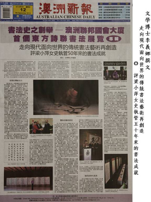 2014年9月22日,中午12.30分是一個值得歷史銘記的時刻。澳大利亞聯邦議會大厦大殿詩聯書法展覽『衝天之飛』,暨慶祝梁小萍女史從藝五十周年慶典盛大開幕。該展覽是梁女史執管
