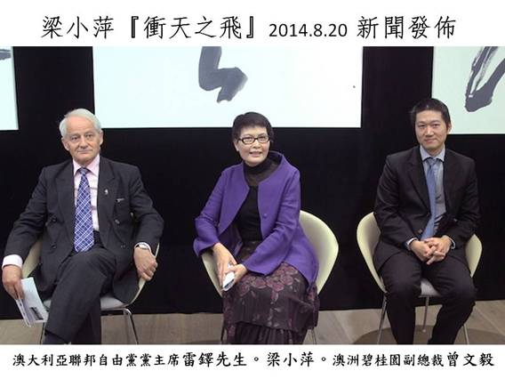 『衝天之飛』新聞發佈會,假澳洲雪梨碧桂園展銷中心舉行。出席的主禮嘉賓、澳大利亞聯邦自由黨黨主席雷鐸先生。他在致詞中,讚揚梁小萍女史在中國文化藝術的傑出成就;『衝天之飛』詩聯書法展,在公民日當天,在聯邦國會大廈舉行,可以讓澳洲公民都能夠分享到中國文化的書法藝術,是一次非常珍貴難得的機會,也因此充份地體現澳洲多元文化政策的成功與寬容。