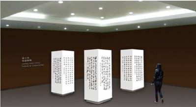 二十首自撰回文七言律詩,分別以中國書法歷史中二十種不同的書法風格,由作者創作而成二十幀作品,其尺寸均為六尺整宣紙(177厘米×95厘米),按中國傳統書法的五體,排列在五個柱體的側面上,而每一種書體則表現以四種不同的書法風格。