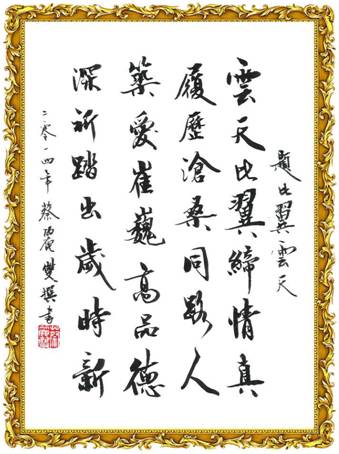 (41) 知妳情竇為我啓, 妳是我的紅顏知已。 花燦喜人迷眼亂, 一懷衷情在聖地兌現。 想是良緣前塵綰, 企盼天賜圓通福祉。 天箋雲錦寫琳瑯, 珍惜青春芽蕊萌綠意。