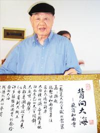 2011年11月洛夫向深圳商報展示「背向大海」長卷