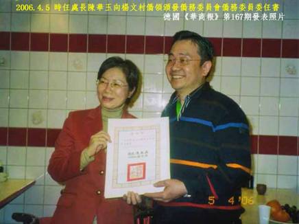 筆者個人亦記得陳華玉當年在處長仼內,舉辦了許多精彩的文化傳播交流活動,甚至連處長官邸都經常成為僑胞的聚會活動地點之一。很多相關活動報導隨著當時的《中央日報》傳達到全球各地。2006年《中央日報》即將停刋,曾經有漢堡中華會館續仼理事長楊文村獲台灣政府仼命為僑務委員會僑務委員,時仼處長陳華玉借歡慶元宵節良辰於「頂好」餐廳向楊文村頒發委仼命令書。其膠巻相機的合影由我拍攝送沖洗後平信寄給德國《華商報》,發表在2006年4月15日《華商報》第167期。陳處長思維細密,很體恤寫作人的辛苦勞動。有一次向我道謝,說出“每次看到報上的報導很是髙興”這樣推心置腹的心裡話。我當面無以言表,內心卻很受撫慰,由衷地感佩陳處長作為一名政府官員誠摯待人的高尚品格。