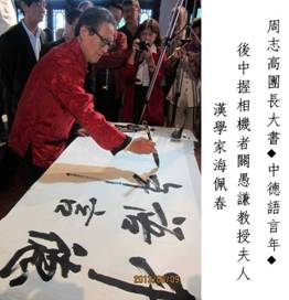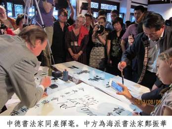 中德書法家的現場書法演藝,使肅立已久的會場頓時沸騰起來。海派書法家兼主持人呂頌憲首先鋪紙落筆“茶樓”(即豫園,徳國人的通俗叫法)兩個大字在右,德國書法家翁貝豪案(Peter Unbehauen)接在左寫上德文“Teehaus”(茶樓)。周志高團長揮筆大書“中國文化年”雄渾厚重。其後按照孔院獨具匠心的設計安排,海派書法家戴小京恭恭敬敬寫下德國大文豪歌德詩句的中譯文“誰能在昨天看到今天,今天則不會讓你無措”(Goethe: und wer im Heute sieht das Morgen, der wird sich ruhren, word nicht sorgen.) 分守宣紙左右兩邊,隨即德方書法家翁貝豪案伏身書寫的孔子論語徳譯文“Wer nicht das Ferne bedenkt, dem ist Betrubnis nahe. Konfuzius ”(孔子語:人無遠慮,必有近憂)躍然宣紙當中部位,以示東西方意義相似的著名格言。