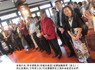 悠揚的笛聲肅靜了人聲鼎沸的會場。吹笛人竟是副團長書法家楊定彪。漢堡金扇俱樂部表演的扇舞帶著中國行家功夫,正合上中國書法展的主題。孔院中方院長耿保生安排我站第一排,是發言人等候的位置。喜見旁立久未謀面的漢堡大學中文系主任符敏怡教授(Prof. Dr. Michael Friedrich),很意外又聯繫上。