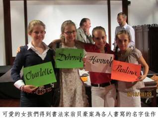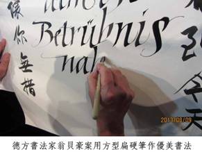 多才多藝的書法家翁貝豪案先生(Peter Unbehauen)同時又是音樂家,出版過有關學習音樂和德文書法藝術方面的多本著作。他的英挺字母書法釋放出他的才情。孔子學院為中國學界人士開啟了西方書法的陌生大門。翁貝豪案先生將自己親手製作的一盒書法硬筆捧給戴小京挑選,要贈送一支給他;盛情難卻,戴小京打開自己的竹筆卷筒,取出一支狼毫回贈,雙方共同譜寫成一首優美的中德文化交流曲。