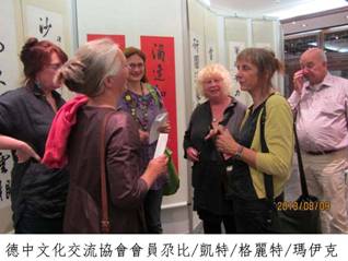 我先後收到德華旅行社和漢堡孔子學院德方院長康易清(Dr Carsten Krause)的電子信邀函,還有孔子學院平信寄出的精美邀請卡,可見得主辦方對於來自漢堡的交好城市上海這個“翰墨情深”海派書法展的重視。第一時間內,我就開始緊鑼密鼓地配合張羅,給我們的德中文化交流協會(Gesellschaft fur Deutsch-Chinesischen Kulturaustausch e. V.)會員和漢堡多位書法愛好者轉發信息。適逢暑假旅游季節,很多人不在漢堡,然留者皆悉心報名,最後竟有沒來得及預先報名的德國藝術家和書法家也到場了。
