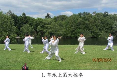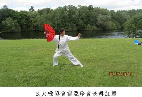 天氣略顯清涼。身著卸寒休閑服的兩岸僑胞歡聚在漢堡東區自然風景勝地歐耶湖(Öjendorf Park )其樂融融。可不是,如茵的綠色草地,背襯著湖光山色,十多位身著潔白絲綢中式套裝的女士們正在一個招數接一個招數整齊劃一地表演太極拳、太極劍、紅扇舞,並換裝紅絲長裙演出新疆舞,為藍天白雲的湖岸平添一層歡樂喜悅氣氛。她們各人來自大陸,自由組合成太極協會。資深太極師宿亞珍任會長兼老師,她和骨幹于學萍巧手製作了肉包子和蔥油餅與眾人分享。
