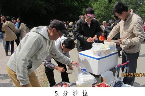 當然,美食的重頭戲同往年一樣,是沉甸甸的大肉棕,夾著花生和香菇。是凡預先報名者,均能領到中華會館秘書許美娟分發的印著粽子圖案的粽子票一張,可品嚐溫熱的粽子一只;另有冷凍粽子供購買自帶回家。免費的會餐還有小烤腸配多種沙拉菜。原籍浙江的知名僑領陳名豪保持著一貫的殷勤,為大家端送分裝在花邊紙碟中的沙拉菜。