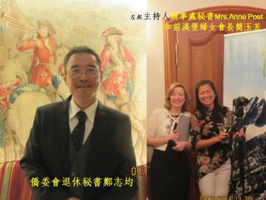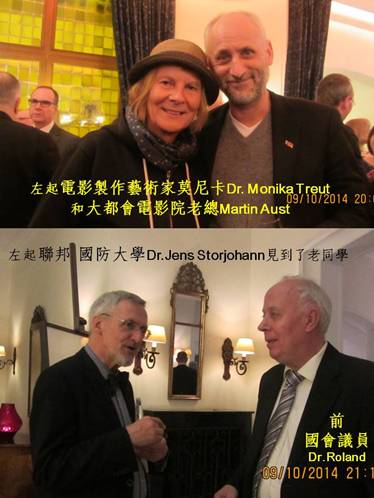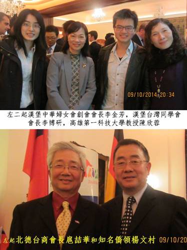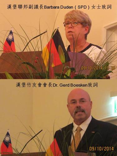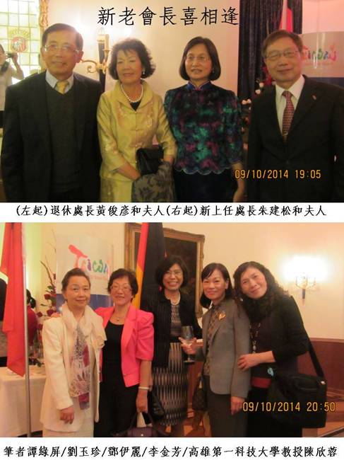 照片 1.新老會長喜相逢.左起退休處長黃俊彥和夫人.右起新上任處長朱建松和夫人 2.左起筆者譚綠屏/劉玉珍/鄧伊麗/李金芳/高雄第一科技大學教授陳欣蓉 3.僑委會退休秘書鄭志均 4.左起主持人辦事處秘書Mrs. Anne Post和前漢堡婦女會長簡玉芳 5.朱建松處長舉杯香檳酒慶賀歡聚一堂 6.朱建松處長伉儷&漢堡聯邦副議長 Barbara Duden (SPD) 7.漢堡聯邦副議長Barbara Duden(SPD)女士致詞 8.漢堡竹友會會長Dr. Gerd Boesken致詞 9.左二起漢堡中華婦女會創會會長李金芳,漢堡台灣同學會會長李博研, 高雄第一科技大學教授陳欣蓉 10.左起北德台商會長扈喆華和知名僑領楊文村 11.左起電影製作藝術家莫尼卡(Dr. Monika Treut)和大都會電影院老總Martin Aust 12.左起聯邦國防大學Dr.Jens Storjohann見到了老同學、前國會議員Dr.Roland Salch 13.左一前北德台商會長黃尚義, 右一漢堡婦女會會長王薏梅 14.台灣留學生小樂隊演出
