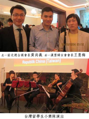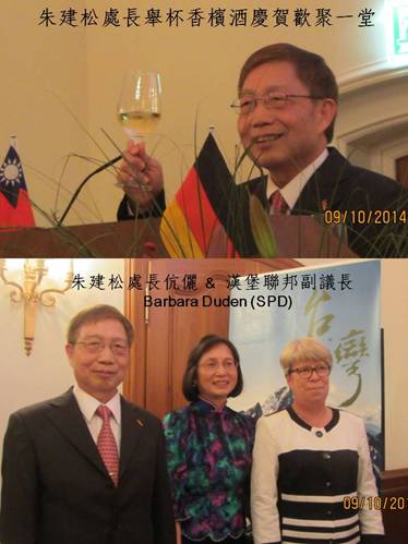 1911年武昌起義的發動日10月10日是辛亥革命的開端。最終成功推翻滿清皇朝,建立了中華民國,成為亞洲第一個共和政體。在台灣10月10日成為國定假日,每年舉行慶典。 金秋十月德國華人台胞節假多。節前驟聞與台僑胞熱絡融洽的原駐漢堡辦事處處長張維達奉調慕尼黑,德北台灣僑團於9月12日晚假樓外樓飯店設宴歡送張處長伉儷,離情依依、衷心致謝。 10月9日於漢堡市中心阿斯達湖畔四季大酒店( Hotel Vier Jahreszeiten)華麗的宴會廳聚集了300多位中外嘉賓。履新走馬上任的新處長朱建松笑容可掬;朱夫人身著典雅中式套裝,美麗端莊。台灣留學生小樂隊的琴聲拉響,喧嘩熱鬧的大廳安靜下來。朱建松處長健步登台,先後用德文和中文熱情洋溢地致詞,著重介紹了台灣的經濟發展狀況。長久以來台灣跟歐盟的關係越來越密切,和德國的經濟貿易互信互助,台灣貿易排名德國海外貿易的第七位。關於不斷發展的兩岸關係,筆者套用《德國之聲》中文網的報導:台灣總統馬英九在接受《德新社》採訪時表示“他願意學習兩德處理雙邊關係的經驗。” 緊接著漢堡聯邦副議長 Barbara Duden(SPD)女士和漢堡竹友會會長 Dr. Gerd Boesken作了友情致詞。 賓客們享用了正宗西式酒會餐點。年青帥俊的服務生殷勤穿梭於密集站立的賓客群體中,端著托盤,奉送小碟精美陪酒西點。正如朱建松處長的開場祝願,喜氣洋洋,歡聚一堂。 朱建松處長曾任駐德國代表處副代表、駐慕尼黑辦事處處長。漢堡中華會館藉借中華民國103年雙十慶,10月10日於館所舉辦文藝娛樂聚餐會,特別引介新處長朱建松與僑胞見面認識。這也是10月底會館搬遷擴大的新址之前告別舊址的最後一次活動。 2014年 10月 14日