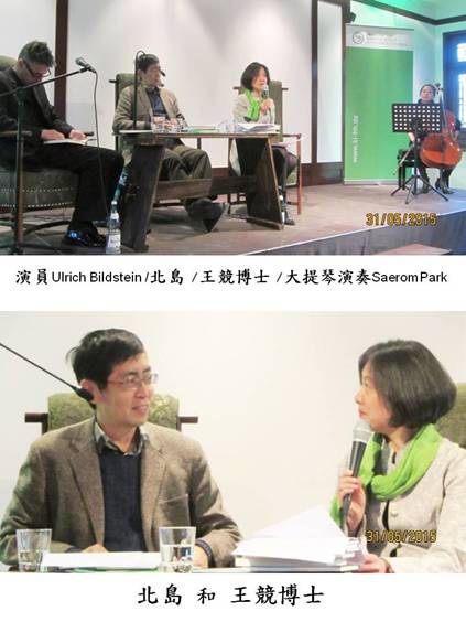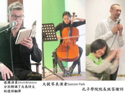 照片說明: 1 (上圖) 演員Ulrich Bildstein 北島 王競博士大提琴演奏者Saerom Park (下圖) 北島和王競博士 2 a北島朗誦b北島不能自持而一度哽咽c稍停片刻 3 (左圖)主持人王競博士 (右圖)北島繼續朗誦 4 a德國演員Ulrich Bildstein 分別朗誦了北島詩文的德語翻譯 b大提琴表演者Saerom Parkc孔子學院院長致答謝詞 5 (上圖)德國漢堡作家兼畫家譚綠屏與中國詩人北島合影(下圖)中德觀眾濟濟一堂