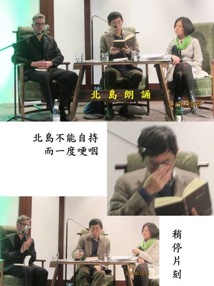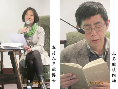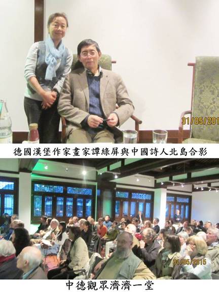 2015年5月31日晚19點30分,這位中國最重要的當代作家之一北島,身姿挺拔,準時出現在漢堡茶樓——孔子學院二樓大廳。漢堡孔子學院定期邀請中國作家直面讀者近距離朗誦、對話的「茶樓文學」,正在舉行北島的《以詩歌和散文作生存良藥》。在王競博士環環相扣的主持下,北島以他低沉的嗓音朗誦了他的多篇詩作和散文章節。德國演員Ulrich Bildstein 隨即分別朗誦了北島詩文的德語翻譯。在誦讀到「蘭房子」一文時,因觸及回首與瑞典世紀詩人托馬斯•特朗斯特羅姆(Tomas Transtromer ,2011年諾貝爾文學獎獲獎者)生前的深重友誼、或者亦因自己相同罹患中風的沉痛往事,一度不能自持而哽咽,場面氣氛凝結,誠摯感人。