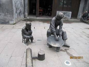 穿越古風偉岸的三門四柱石牌坊,拓寬的古街陳列著一批真人般大小的市井人物銅塑像。他們補著鍋、修著鞋、磨著刀、拉著黃包車、挑擔賣餛飩、給小男孩打油。我聯想到漢堡久負盛名的城市代表雕像-一尊肩擔水桶的挑水伕,十九世紀中葉消亡的職業,也是市井小民。兩地心有靈犀地共同記錄了己經逝去或正值凋零的歷史陳跡,共同寓意了社會的平等尊嚴,不論職位髙低。