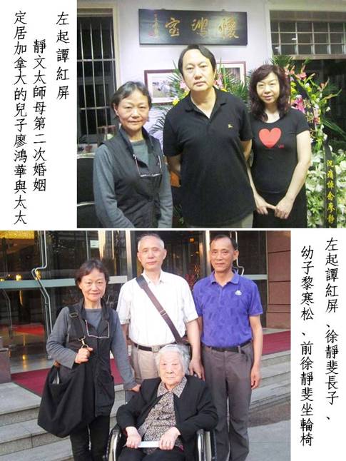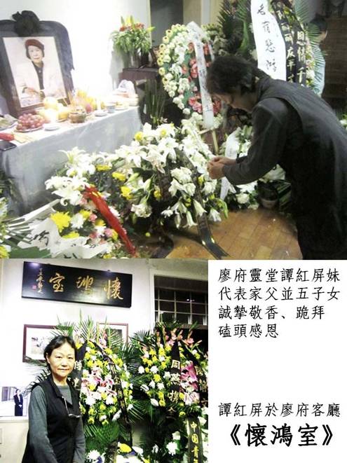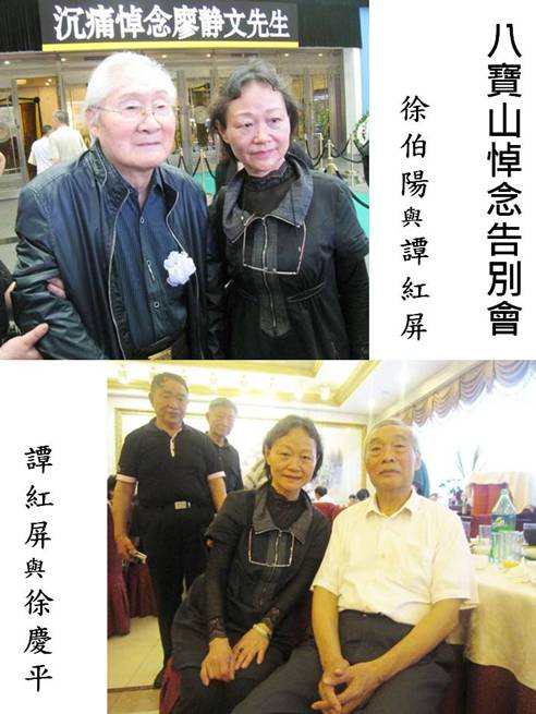 圖片說明: 1.靈位上的廖靜文先生2015.6.20 端午 2.靜文太師母為筆者譚綠屏二○○二年出版的書『揚子江的魚 易北河的水』親筆題字:一步一個浪花 3.廖府靈堂譚紅屏妹代表家父並五子女簽名 家父譚勇並五子女敬獻的輓聯花圈 4.廖府靈堂紅屏妹代表家父並五子女誠摯敬香、跪拜磕頭感恩 譚紅屏於廖府客廳《懷鴻室》 5.左起譚紅屏、靜文太師母第二次婚姻定居加拿大的兒子廖鴻華與太太 左起譚紅屏、徐靜斐長子、徐靜斐幼子黎寒松、前徐靜斐坐輪椅 6.八寶山悼念告別會 徐伯陽與譚紅屏 譚紅屏與徐慶平 7.徐悲鴻後人。前排右起:徐悲鴻與蔣碧薇的兒子徐伯陽、女兒徐靜斐,徐悲鴻與廖靜文的兒子徐慶平、女兒徐芳芳。 8.悲鴻大師墓前,悲鴻家人後人 後排左起:徐芳芳的先生(美國人)、徐芳芳兒子 、徐芳芳、徐靜斐長子、徐慶平、徐靜斐、徐伯陽 前排左起:徐慶平的兒子、徐伯陽的太太、徐靜斐長子。徐靜斐的女兒徐伯陽的兒子 8.譚紅屏於悲鴻大師墓前