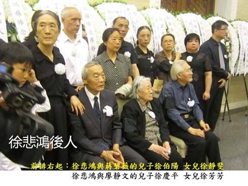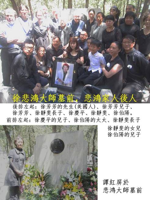 6月20日端午9時,徐悲鴻夫人廖靜文的告別紀念會在八寶山殯儀館舉行。來不及訂購機票,我不能如願親自前去拜別。家妹紅屏代表老父和五子女緊急乘火車從南京赴北京,參加靜文太師母追悼會。19日午後到北京,當晚悲鴻紀念館即派車接去設在廖府家中的靈堂拜祭。次日民眾前往八寶山悼念告別的老老少少達上千人。代表了人民大眾對廖靜文太師母的敬意和懷念。紀念會之後紅屏隨同悲鴻夫人的家人親友一起參加了悲鴻大師的掃墓祭祈。在廖府靈堂和悲鴻大師墓前,紅屏妹代表家父並五子女共同徐悲鴻的後人家人齊致誠摯跪拜磕頭感恩。