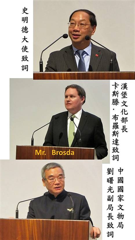 六月八日漢堡國際海事博物館人聲鼎沸、熙熙囔囔、白衣侍者穿梭。作為中德建交45周年系列文化活動之一的“東西彙流——13至17世紀海上絲綢之路”展覽隆重開幕。史明德大使、漢堡文化部長布羅斯達(Brosda)、中國國家文物局副局長劉曙光、駐漢堡總領事孫從彬、付總領事王瑋、柏林大使館文化參贊陳平等嘉賓共同