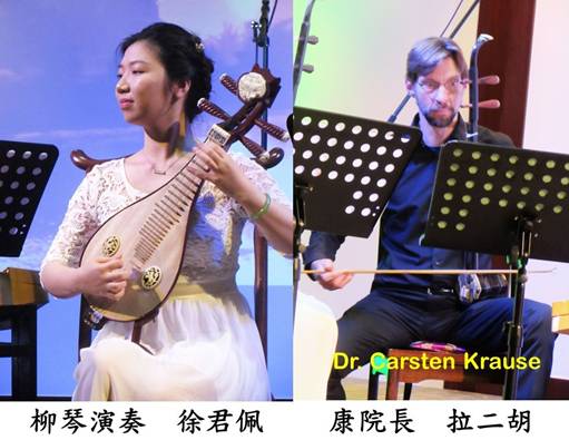 Carsten Krause)不僅擅長跑步,創建了“漢堡——上海馬拉松橋”,而且殊不為人知的是他青少年時代就拜師學藝,拉上一手正宗的好二胡。正是康院長發起,與漢堡知名民樂古箏演奏家李夢娜一拍即合。李夢娜胸有成竹,精於音樂的策劃,於是一場有聲有勢、老外加入的中國傳統管弦樂音樂會,就正式在漢堡孔子學院十週年的慶會打響。可謂和曲昇平、餘音繞樑。博得一片由衷喝彩和熱誠擊掌,聽得入神的人們甚至忘記了品嚐隨手可得的月餅茶點。演出的節目有古箏、古琴、柳琴、二胡、鋼琴、小提琴等中西樂器的合奏和獨奏,還有合唱團的中文合唱。