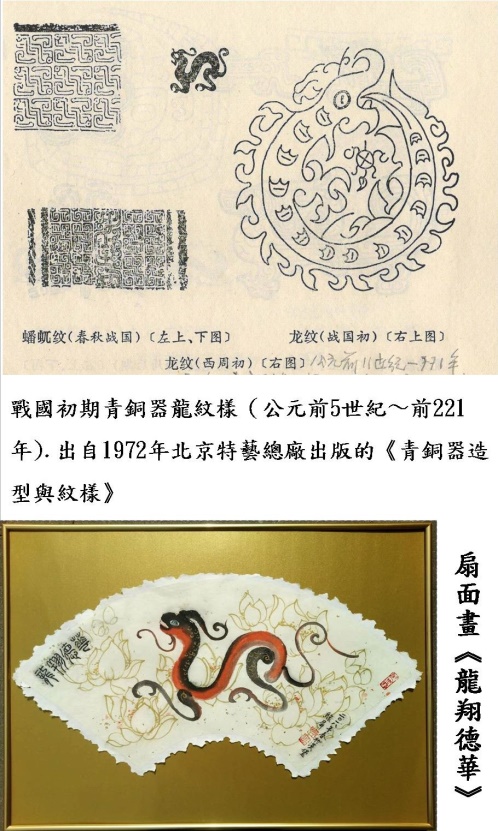 扇面本身具備擴張散開之意。一條戰國初期(公元前5世紀∼前221年)青銅器紋樣的龍,吉祥飛舞在灑金扇面金色的蓮花之上。「龍翔德華」,既寓意放飛於德華旅行社的興旺,又寓意放飛於德中兩國的祥和。蓮荷諧音聯合。創意獨特,天下無雙。