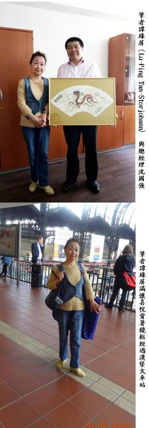 換上混合金線編織的針織上衣,背上50x70cm的金色鏡框,頂著燦爛的陽光,於漢堡火車總站下車。滿懷喜悅,我親自送畫到德華旅行社辦公室。沈總興致勃勃,親手打開層層包裝,詳細詢問繪畫表達的涵義,並開心請來員工幫忙拍攝合影。