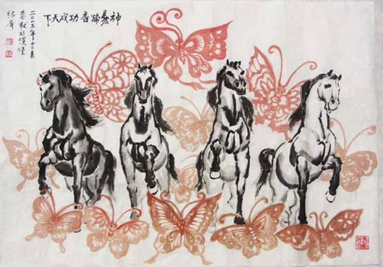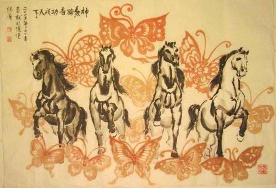 世界上最負盛名的雕塑馬--柏林勃蘭登堡門樓上的四匹神馬(Auf dem Brandenburger Tor befindet sich die Quadriga),榮載史冊、踏花歸來;新年伊始它們即期化著自由無羈絆的水墨馬破門而入。馬蹄聲中,德中合力、功成天下,百業昌榮、百姓安樂。