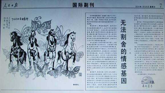 新紀元的甲午,中國人頂天立地站立起來。 中國的事能夠辦好!中國的事一定能夠辦好! 感謝《人民日報》記者悉心推薦,編輯精心編排,圖版之大佔用了版面頭條一半多的橫向位置。記者告知:“是個頭條,效果很好!” 家人好友皆大歡喜。祈願與每位畫前大德同禧同慶馬年新春!