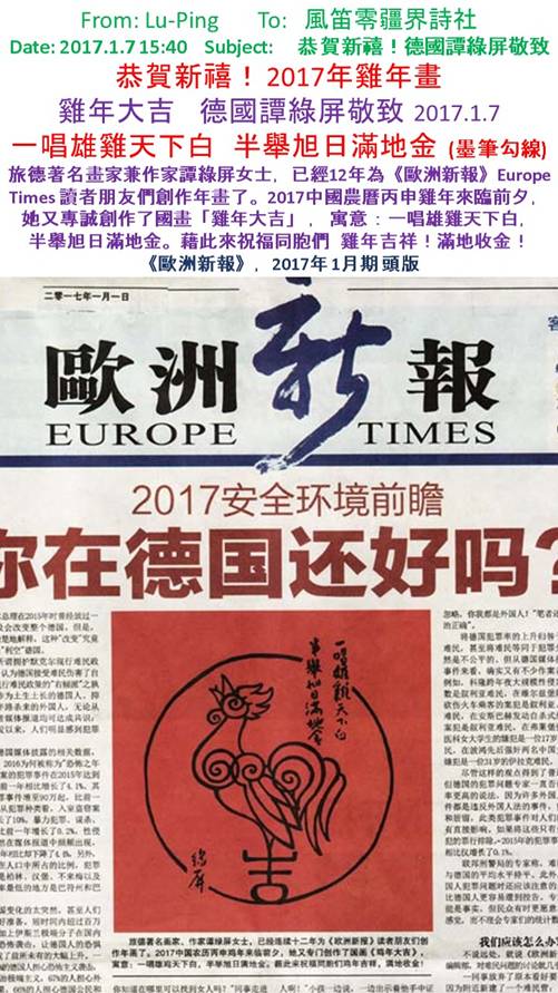 旅德著名畫家兼作家譚綠屏女士,已經12年為《歐洲新報》Europe