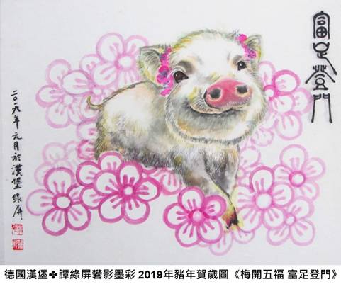 歡歡喜喜迎豬年。在中國人眼裡豬像征著圓滿和福氣,恰好德語中的“豬”也意味著幸運和富裕。善良的人們心願國泰民安繁榮昌盛。賀歲圖《梅開五福富足登門》喜借豬的富貴之足和豬(足)的富貴諧音,登門送福。