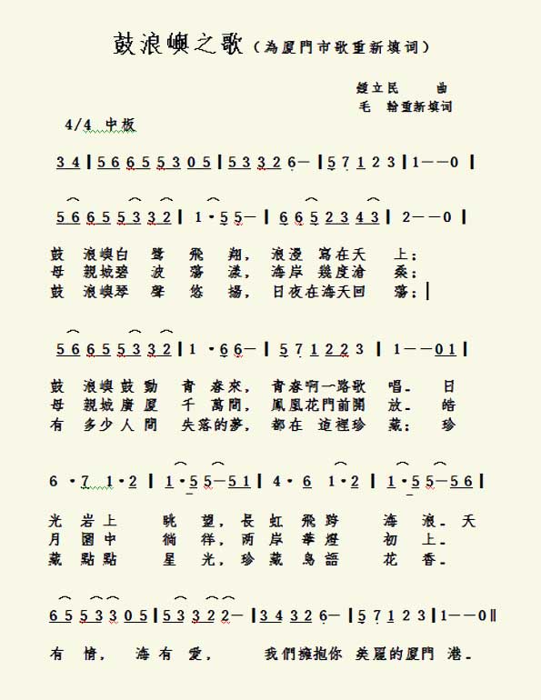 前年9月,我試著改寫《鼓浪嶼之波》,當時自擬的修改原則是,尊重原作,盡量保留其原有的語句和意象,只作最低限度的修改,改變其主題和情調,將台胞思鄉,改為廈門之戀,將感傷幽怨,改為明麗甜美,努力使之具有廈門市歌應有的內涵。並寫成《鼓浪嶼之波與廈門市歌》一文,發表在《廈門日報》《中國文化報》。 去年,我對歌詞做了進一步的修改,請青年歌手呂金蔓演唱,音頻發表到中國新聞網、福建新聞網等。 最近,在音樂大師鄭小瑛教授的熱情鼓勵和指教下,我慘淡經營一周,對歌詞做了徹底的修改,鄭小瑛教授還屢次予以訂正。這一稿,我自己算是竭盡全力了。歡迎朋友們繼續指教!