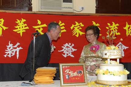 (墨爾本訊)世界華文作家交流協會的秘書長黃玉液(心水)與該會中文秘書婉冰,為了慶祝牽手五十週年的金婚典禮,於十一月十六日,假座墨爾本外效Oakleigh 中心滾球場大禮堂,舉辦了一場別開生面的隆重新書發佈會。 簽名桌旁長檯上擺放了婉冰散文集“舒卷覓餘情”與心水再版的“沉城驚夢”,讓蒞臨賀金婚的嘉賓們深感意外。 包括翁瑛敏處長、雷謙光盟長、陳之彬伉儷、蘇震西前市長、黃巧敏組長、王懷德秘書、劉國強委員、林見松伉儷、區鎮標主席、柯志南董事長、馬世源伉儷、吳天佐會長、慈濟會謝坤耀先生、趙捷豹先生、周偉文社長、黃惠元副社長、鄭毅中台長等傳媒代表、潮州會館副會長們、中華青年會、華青體育會、知用校友會、世華作家交流協會、華校協會、中華公學、欽廉同鄉會及史賓威亞裔工商會等約二百位嘉賓蒞臨祝賀。(僑領過多、恕難盡錄) 與作家夫婦深交的游啟慶司儀,開場白中介紹了心水與婉冰的著作及除了多項文學獎外,兩夫妻更獲得包括聯邦總理、州長、市長等不同類別的服務獎與多元文化傑出貢獻獎。此次五喜臨門慶典,特以「文采風流、福壽並瑧;鴛鴦比翼、美意延年」贈言祝賀。 墨爾本帷幄房地產公司董事長黃明仁太平紳士,代表黃家兄姐們致歡迎詞,由黃府長媳婦朱曉娟翻譯國語;他向嘉賓們介紹了四位兄姐後,祈望父母將來再辦鑽石婚及七十年、八十年的牽手典禮。 外孫女張伊寧亦向貴賓長輩們致歡迎詞。 駐墨爾本台北經濟文化辦事處翁瑛敏處長致賀詞,對兩位作家在文學上的成就及金婚禮祝福,最後盼望十年後心水夫婦鑽石婚時在座全體嘉賓們都再來道賀,博得全場掌聲。並代表頒發散文獎獎狀給心水先生。 專業會計師、長孫女黃如珮用純正的華語致謝詞,孫兒黃永良與外孫女張伊婷一齊向長輩們致謝。 婉冰粵語發言,情真意切,自己亦感慨動容。心水致詞時,感恩其先岳父母當年將掌上明珠許配給他,說娶到好太太會影響四代人,並在全體到賀嘉賓及兒孫們前,向婉冰三鞠躬,一感謝她事奉公婆、二感謝她五十年來不離不棄同時是其作品的首位讀者、給予校對修正錯別字,三感恩她為黃家養育了五位出色的兒女,同時是六位孫兒女們的好祖母、好外婆,詞畢全場報以歷久不散的掌聲。 心水秘書長代表“世華交流協會”頒贈紀念銅牌、給予對該會自創會以來積極支持的六位領僑,依次是雷謙光、柯志南、林見松、劉彪、游啟慶及鄭毅中。兩位作家分別贈送新書予雷謙光、區鎮標、馬世源、郭乙隆、蔡旭亮、陳冠群等多位僑領及親友們。 切蛋糕時、男女主角在滿堂兒孫們及全體來賓、一齊為於生辰結婚的壽星心水唱生日歌,場面溫馨動人。近五時賓客們始帶著歡喜心賦歸。